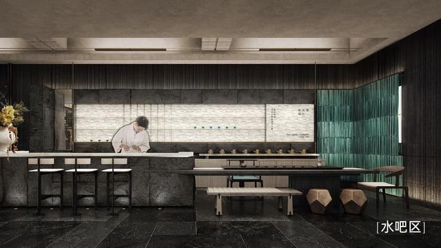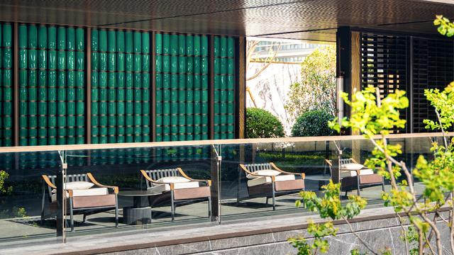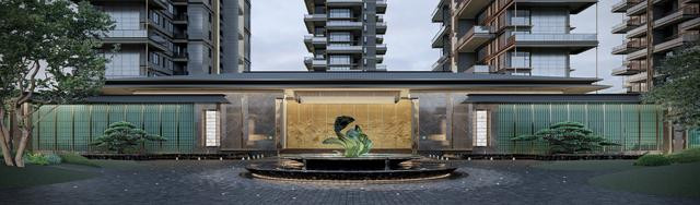 约80米奢雅门庭,承“天青汝窑镀金边”之技法,青瓷竹影景墙、山水照壁与两侧水院徐徐铺陈,如同一幅山水画卷跃然眼前,塑造出有仪式和归属感的社区门庭空间。
